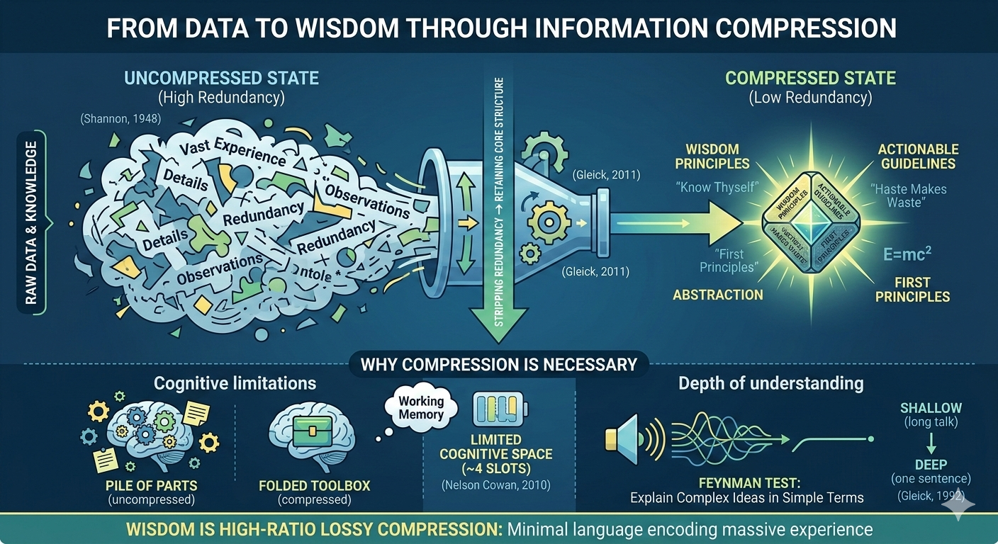 Wisdom can be defined as lossy compression at an extremely high ratio. A person takes a massive volume of information, experiences, and hard-won lessons and compresses them into a few sentences. Those sentences have lost enormous amounts of detail. But they have preserved the most essential causal structures and action guidelines. The higher the compression ratio—meaning the more raw information distilled into fewer words—the higher the wisdom content.